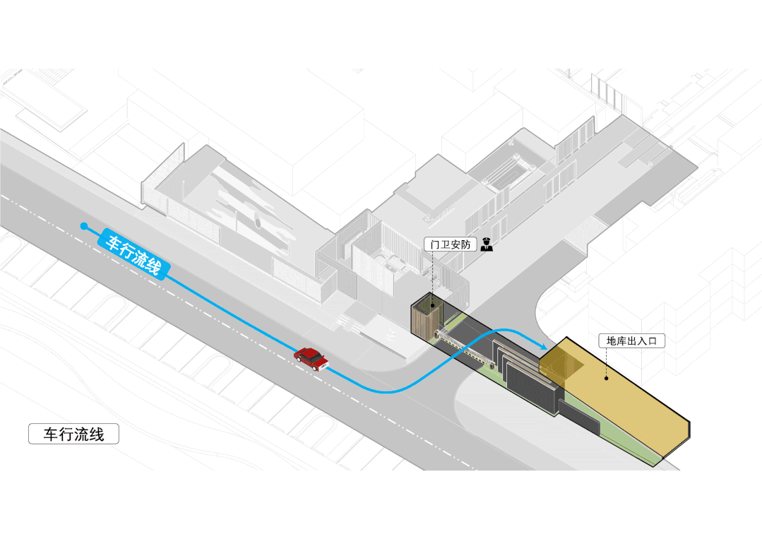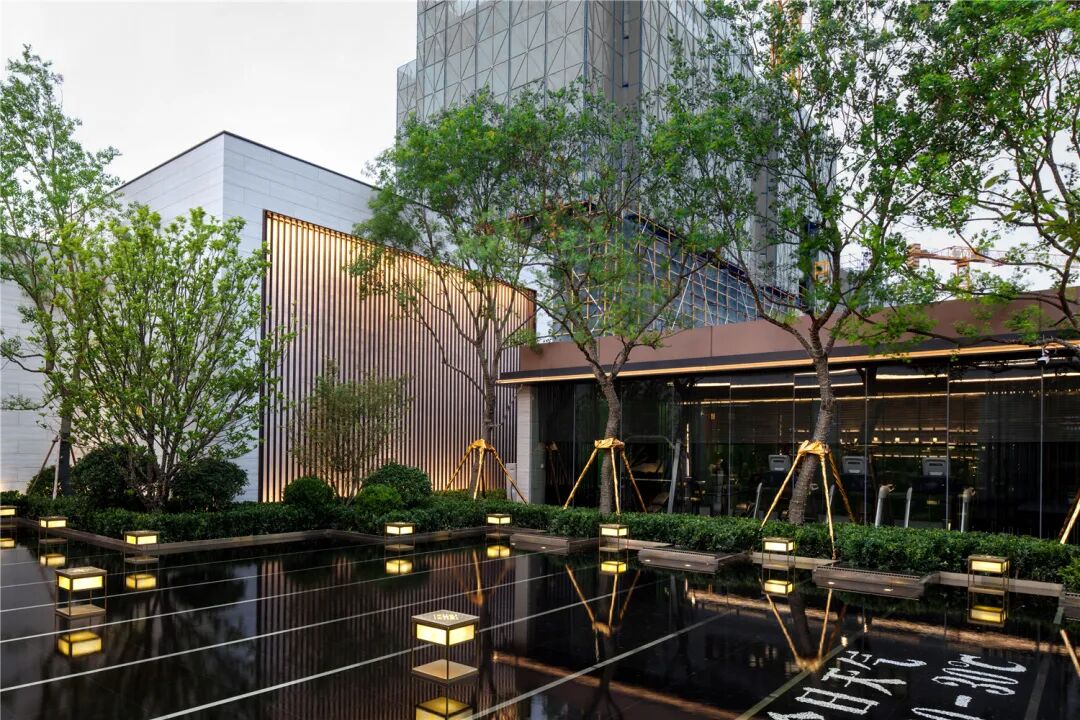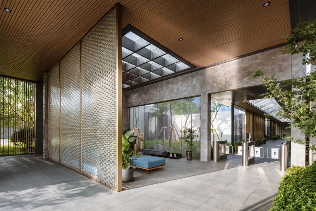 横向飘檐和层层错叠的片墙,搭配铜色格栅、独特雕塑极简的设计,形成独特而富有昭示性入口,有趣的是通过雕塑的引导把车行与人行完全分开了,向右是车行及下地库的入口,向左是富有诗意的“安心客厅”。