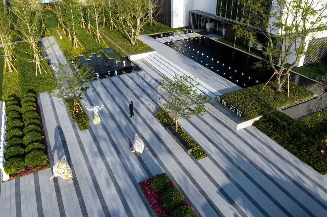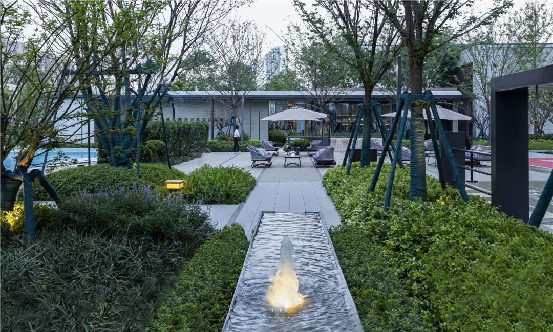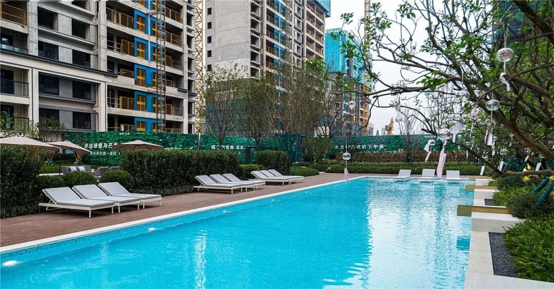 走过风雨连廊,心已回归平静,此时出现在眼前的是一方清澈的泳池,打造社区私属生活圈的美学艺术,水面与静谧的庭院相映衬,呈现出一个独属社区居民的温情小世界。