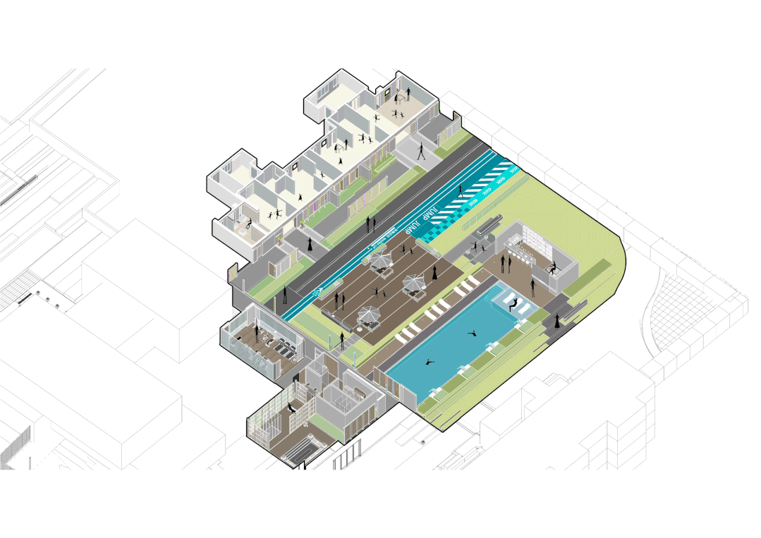 “混龄客厅”的营造,着重将用户生活方式、空间感受与情感体验纳入设计考量,关注人与空间更深层的连接与互动,艺术与生活的具象表达。通过健身房、瑜伽房、阳光泳池、摩尔庭院、即刻运动场、儿童主题架空层、室外吧台七大触点共享空间,丰富儿童、青年、老人三大人群的日常生活,同时打破年龄的界限,让志趣相投的人们相互交流,消解闹市的喧嚣忙碌,让生活有温度,让居民随时随刻都能在此偶遇生命中的美好。