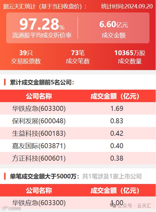 2024年9月20日,大宗交易成交金额6.60亿元,交易股票数39只,成交笔数73笔,流通股平均成交折价率97.28%,成交数量1.04亿股。