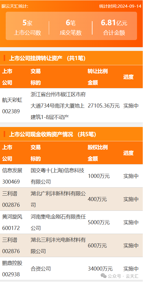 2024年9月14日,资产交易成交金额6.81亿元,上市公司5家,成交6笔,上市公司挂牌转让资产1笔,现金收购资产5笔。