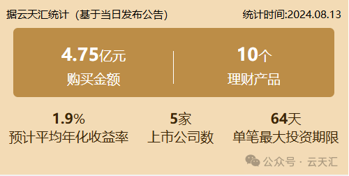 2024年8月13日,上市公司购买理财金额4.75亿元,共5家上市公司,理财产品10个。