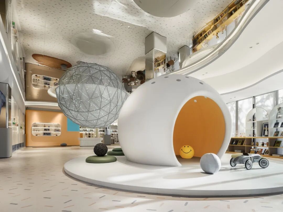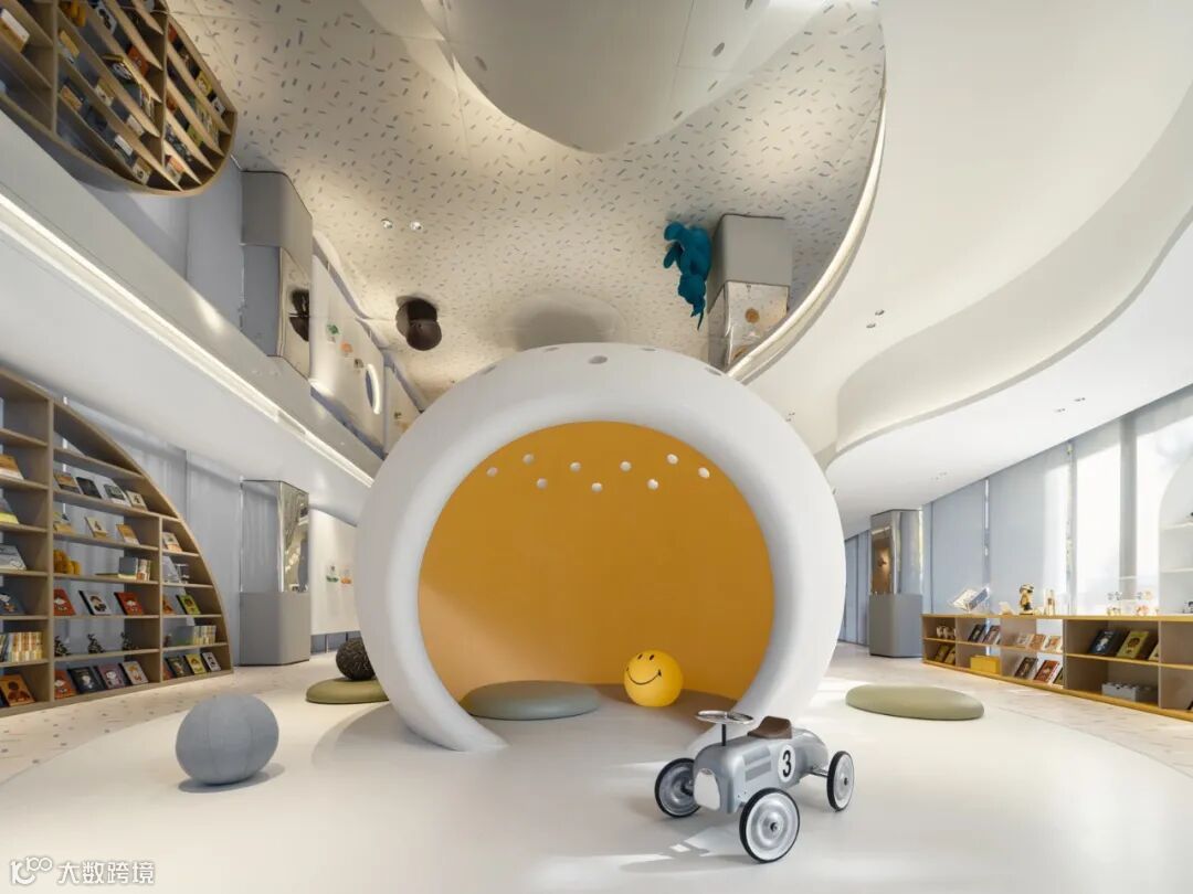 星球、陨石、种子、奇异的外太空生物是这个想象力王国的基本构成元素,巨大的陨石是空间中绝对的视觉重心,在天花镜面的反映之下带来奇异的空间错位感。我们以“宇宙博物馆”作为童文馆的设计主题,营造了一个富含文化、艺术、情感交流的沉浸式社区文化场景。