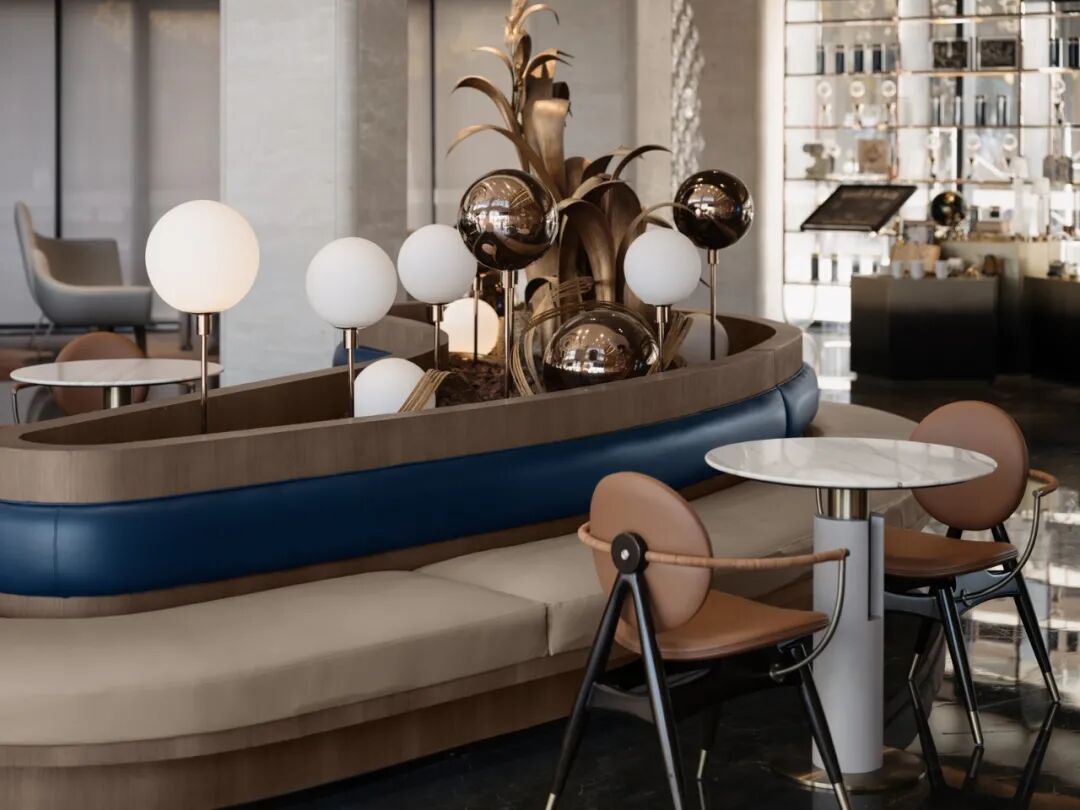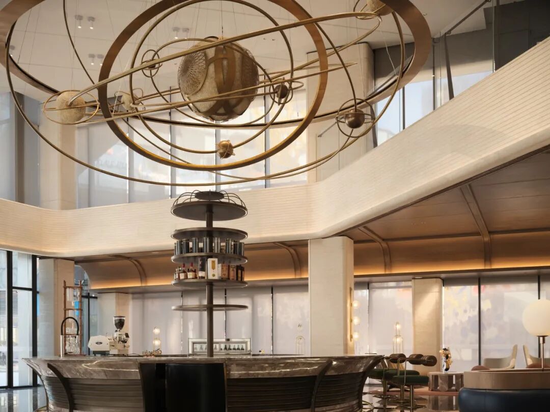 当夕阳的最后一丝余晖消失在天际线之后,入夜的微醺小剧场便就此开张,线条灯带在金属上晕染化开,吧台上忽明忽暗、缓慢转动的星系是灵魂愉悦的信号表达。