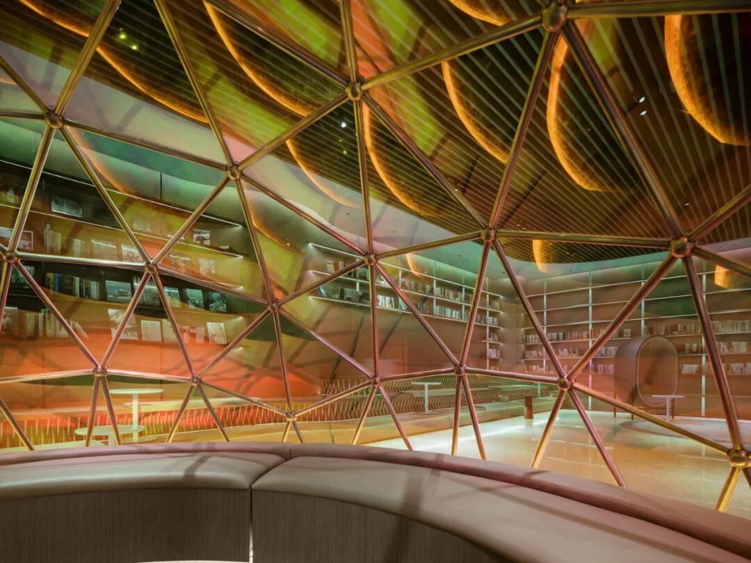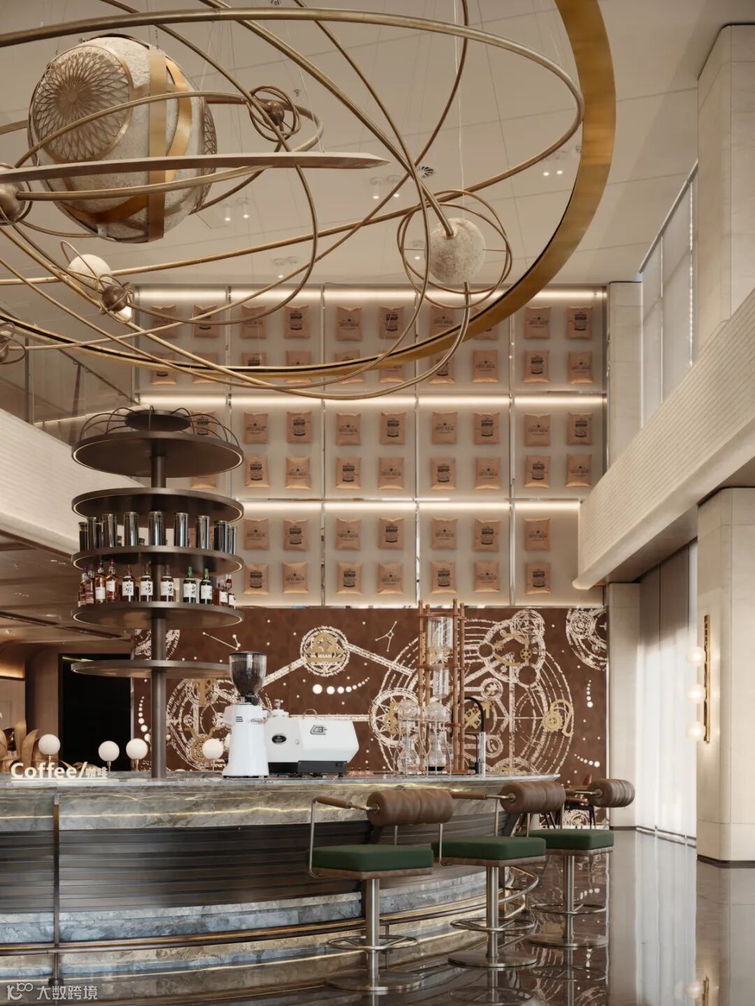 进入到咖啡馆内,行星沿着轨道缓慢运转,万物的生命与物质的宇宙展现在人们眼前,时间在此停止,在螺旋分形结构的巨大行星装置之下,留下静谧的哲思。