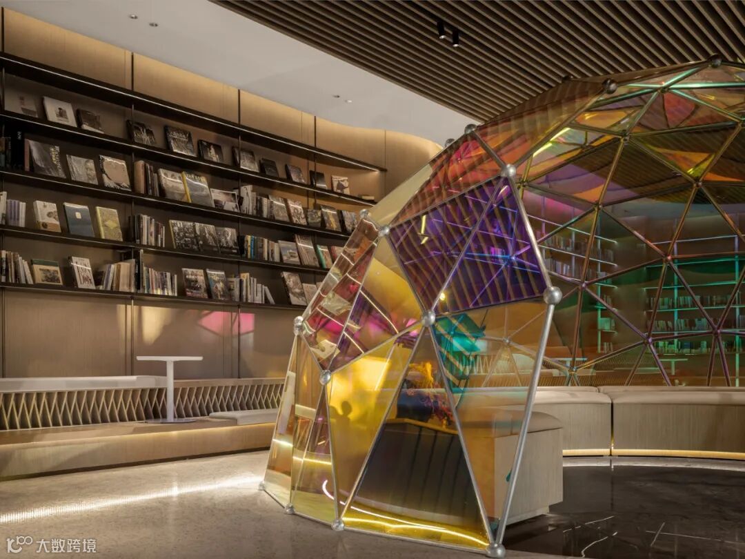 定位于奇点书集“艺术+书店”的前卫阅读场景,我们将这个人类无法想象的奇点具象化,由无数三角形相连构成出一个半球形空间,彩色半透明的亚克力材质将光进行广域处理,呈现出五彩缤纷的视觉环境,人们在此阅读,不断挑战由抽象到具象的创意边界。