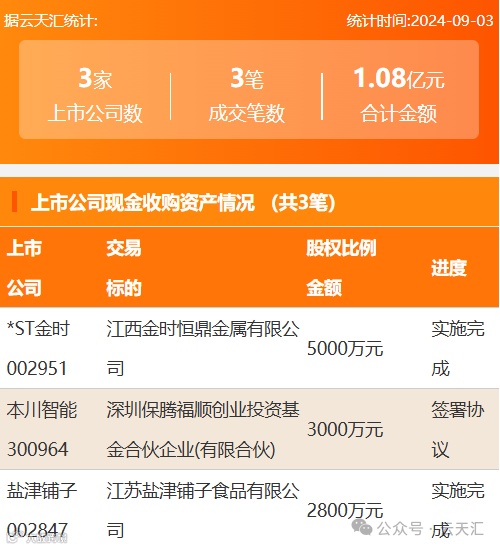 2024年9月3日,资产交易成交金额1.08亿元,上市公司3家,成交3笔,上市公司现金收购资产3笔。