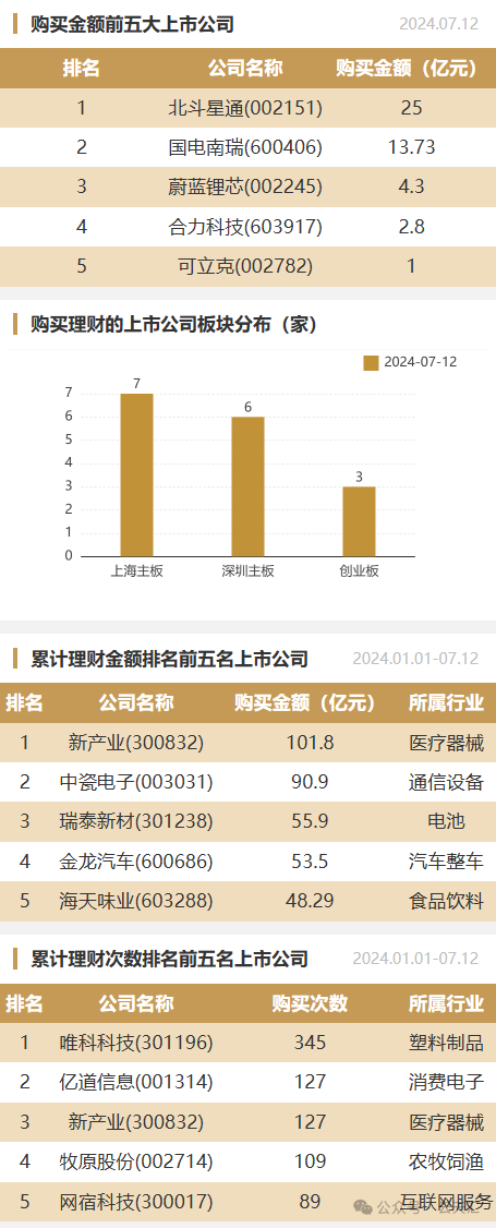 2024年07月12日,上市公司购买理财金额52.38亿元,共16家上市公司,理财产品45个。