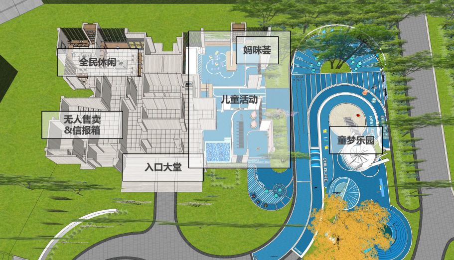 成果内容摒弃传统社区中的极致化功能场所,创新性的提出匹配现代社区用户需求的四大中心——交融中心、活力中心、交互中心、共享中心,营造全新的未来社区空间格局。