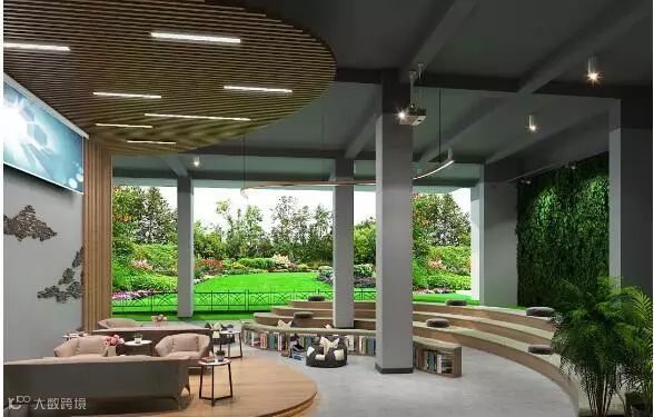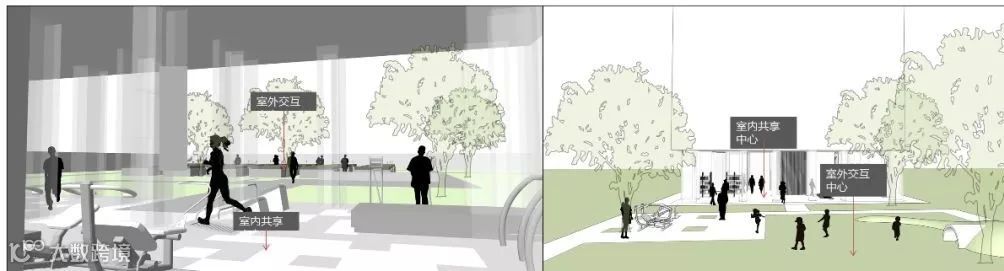 依托架空层室内的公共空间,结合室外公共区域,打造室外内功能联动的综合空间。室外场所可结合室内功能选择交互中心功能模块,形成体系化的功能延伸。