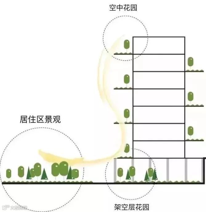 在大约三分之二的楼栋首层设置为架空层,架空层约6-10米挑高,打造成业主的“共享公共空间”,并尽可能的与场地内的园林打通,形成一个大整体。