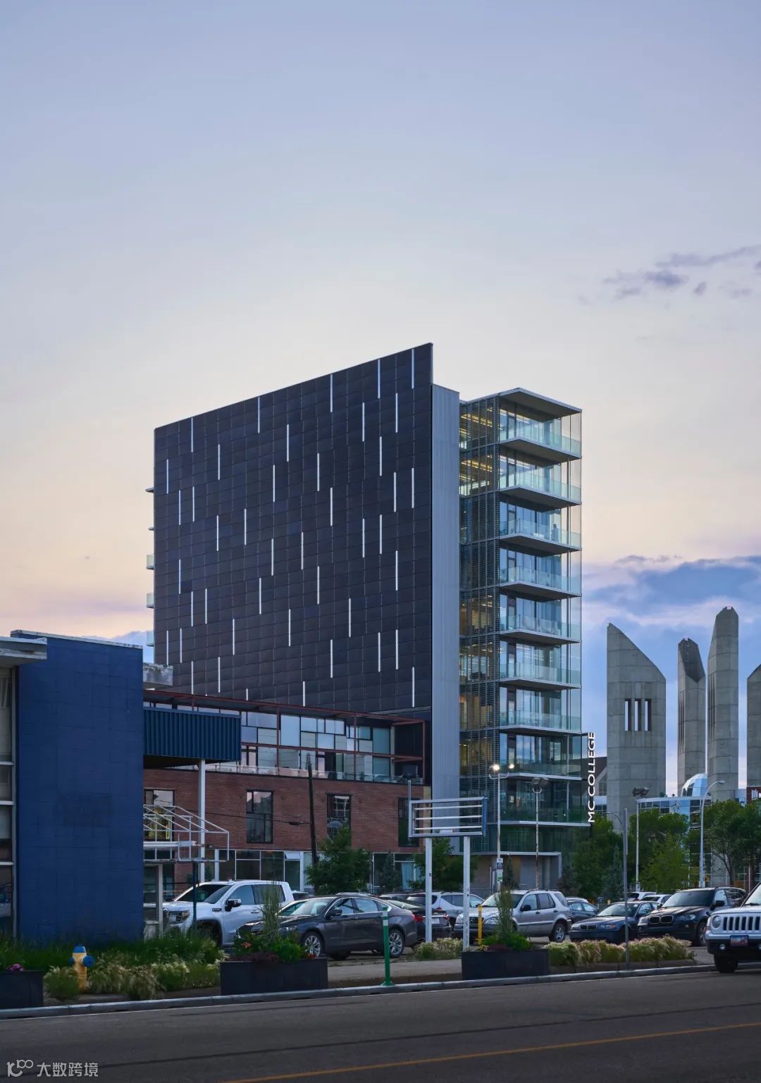 它的560个光伏板提供了80%的建筑电力需求。这座建筑与城市的电网相连,在阳光明媚的日子里可以恢复多余的电力。