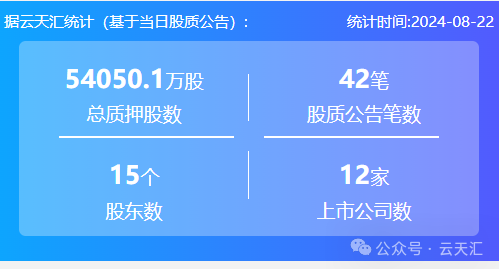 2024年8月22日,股票质押总质押股数5.4亿股,上市公司数12家,股质公告笔数42笔,股东数15个。