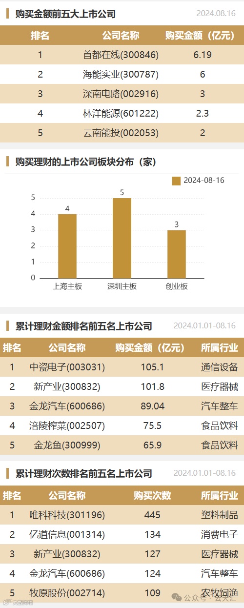 2024年8月20日,上市公司购买理财金额16.59亿元,共9家上市公司,理财产品24个。