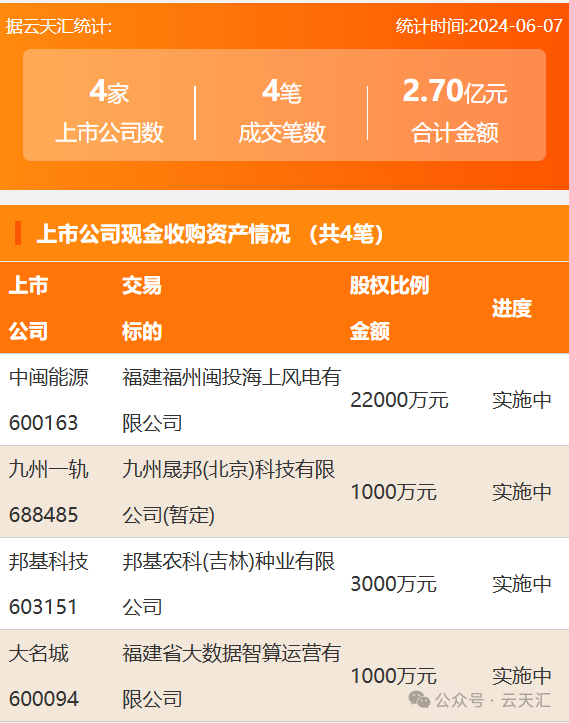 2024年6月7日,资产交易成交金额2.7亿元,上市公司4家,成交4笔,上市公司现金收购资产4笔。