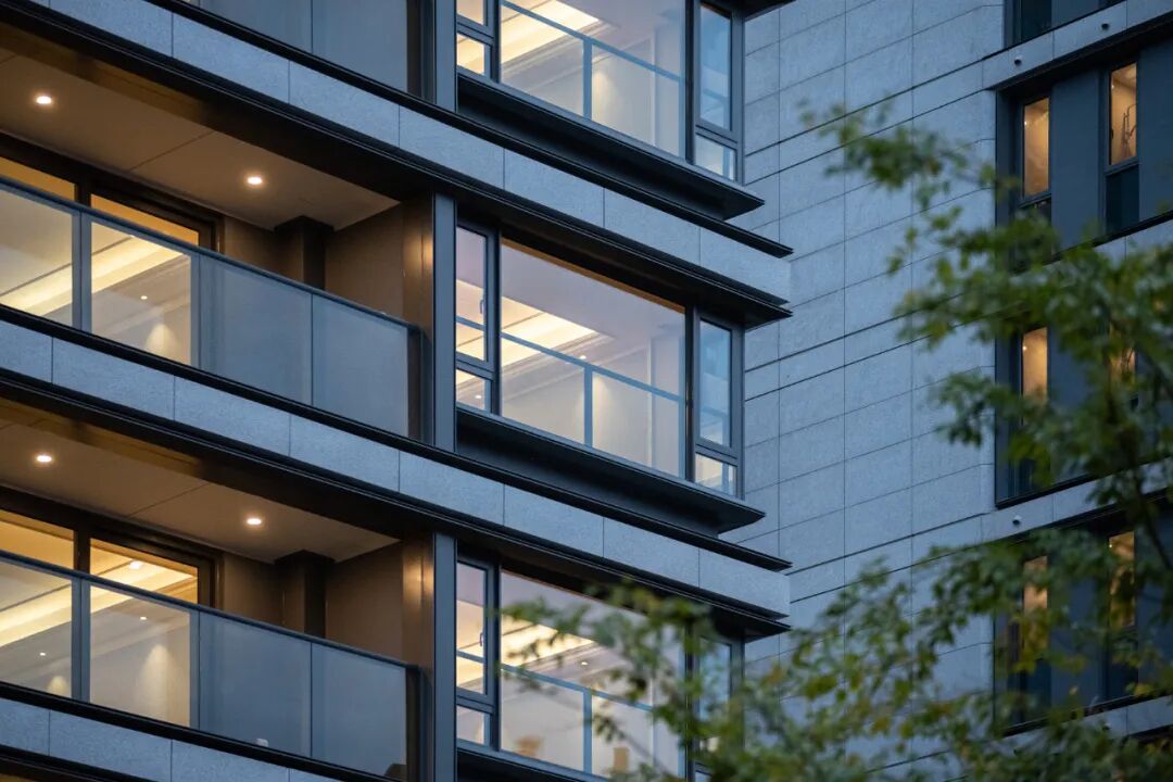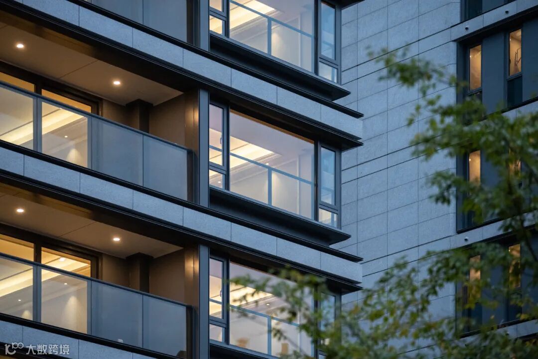 出于立面整体性的考虑,常规做法通常会首选玻璃或百叶等材料对飘窗基座进行遮挡美化。但是我们选择摒弃多余构件,将飘窗自身的构造特点在立面上自然呈现,并在飘窗板端部以精致线条收口,内凹部分应用铝板同色涂料。最终所呈现的效果,自然镂空的飘窗在立面上形成了第二道层次,而转角飘窗的开口设计也更凸显轻盈灵动的形体感。