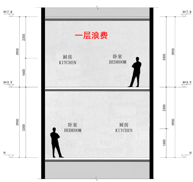 传统3.9米层高,一层高,两层矮,高度浪费……