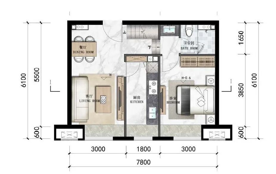 ▲ 全尺寸2厅+ 2.5房,55平方米体验完整两居半的舒适享受