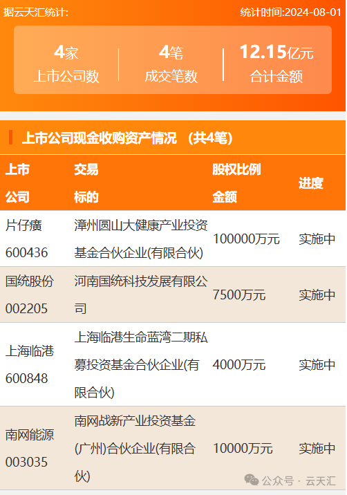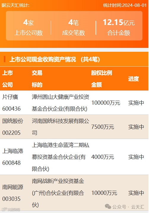 2024年8月1日,资产交易成交金额12.15亿元,上市公司4家,成交4笔,上市公司现金收购资产4笔。