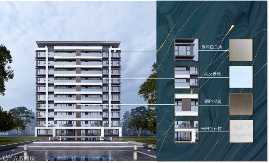 综合运用不锈钢金属、铝板、石材、涂料等多种材料,每一种材质都有自己独特的质感,而且整体立面的配色也相当讲究,善用材料色彩的多样变幻与组合,颜色层次之间互相衬托,使建筑性格更加鲜明,为立面的设计语言增添细节,既保证了项目外立面的高端品质,又保证了社区整体外立面的时尚现代之感。