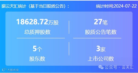 2024年7月22日,股票质押总质押股数1.86亿股,上市公司数3家,股质公告笔数27笔,股东数5个。