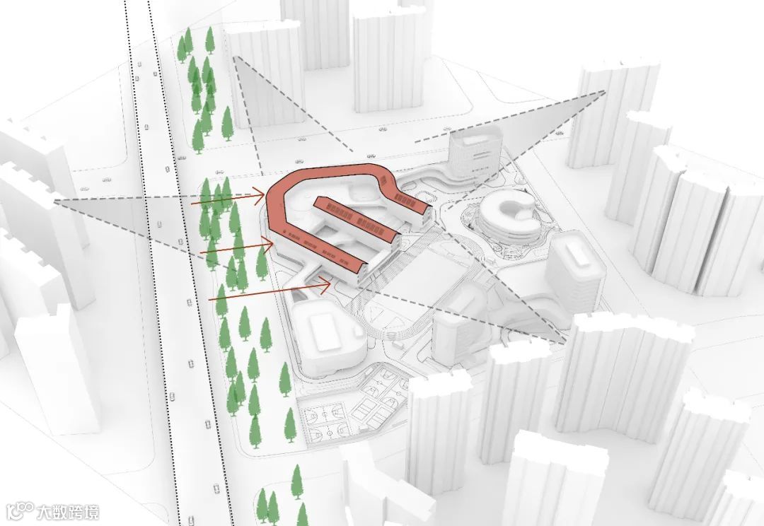 园区主入口“藏”于基地西侧,用高墙阻隔与行车道较短的距离;停车场“藏”在建筑内部一楼。