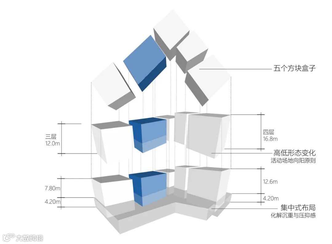 建筑以五个简洁的方块盒子进行组合和形态变化,化解沉重与压抑感。因场地局限和活动场地向阳原则,建筑体量于场地西北侧集中式布局。