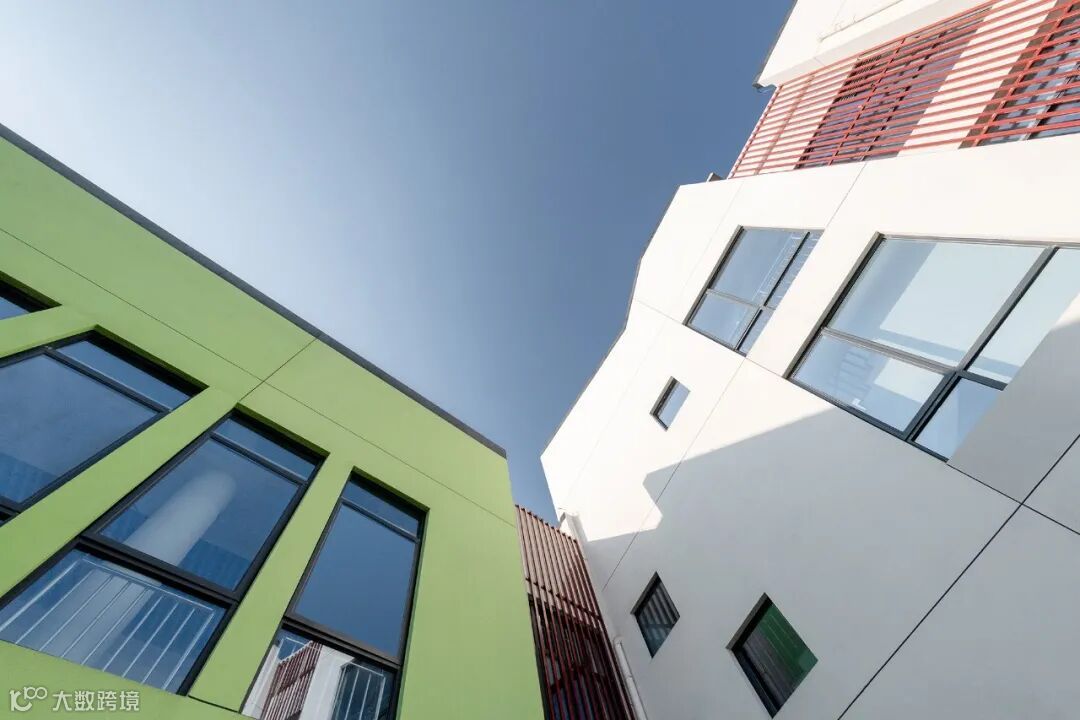 近人立面打造趣味窗洞,增加面凸凹设计改善墙面的单一性,简单而丰富的立面于无形之中自有一种浓郁的韵律感,获得轻巧生动、坚实有力的外观形象。更多精品关注校园建筑
