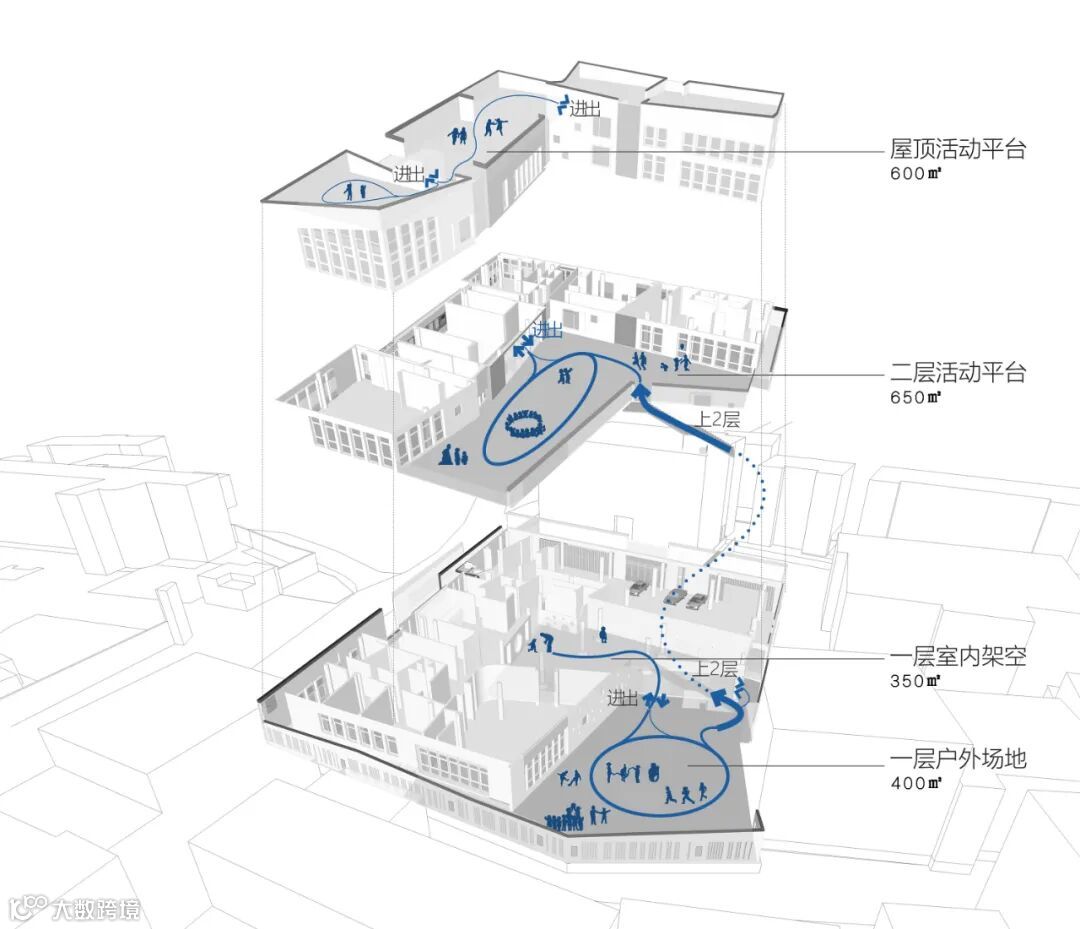 从运动场、大台阶、架空平台到内庭院,再到屋顶阁楼活动平台,形成由低到高逐层抬升的多层级空间,为学生创造了丰富立体的室外学习交流活动场所,宛如“梦想舞台”。