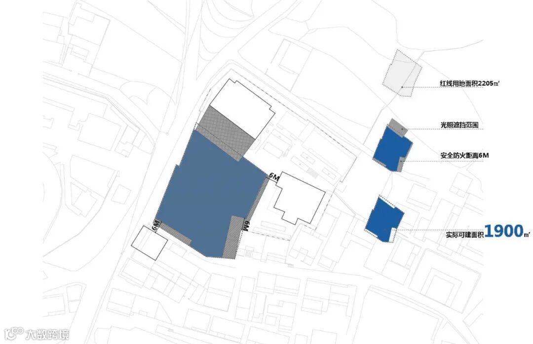 幼儿园的场地大体为北偏东30°左右的正方形,长52m宽42m,基地用地面积共2205㎡。根据相距邻近建筑物6M的安全防火规范和不遮挡临近建筑物采光的基本原则,场地可建范围仅有1900 ㎡。