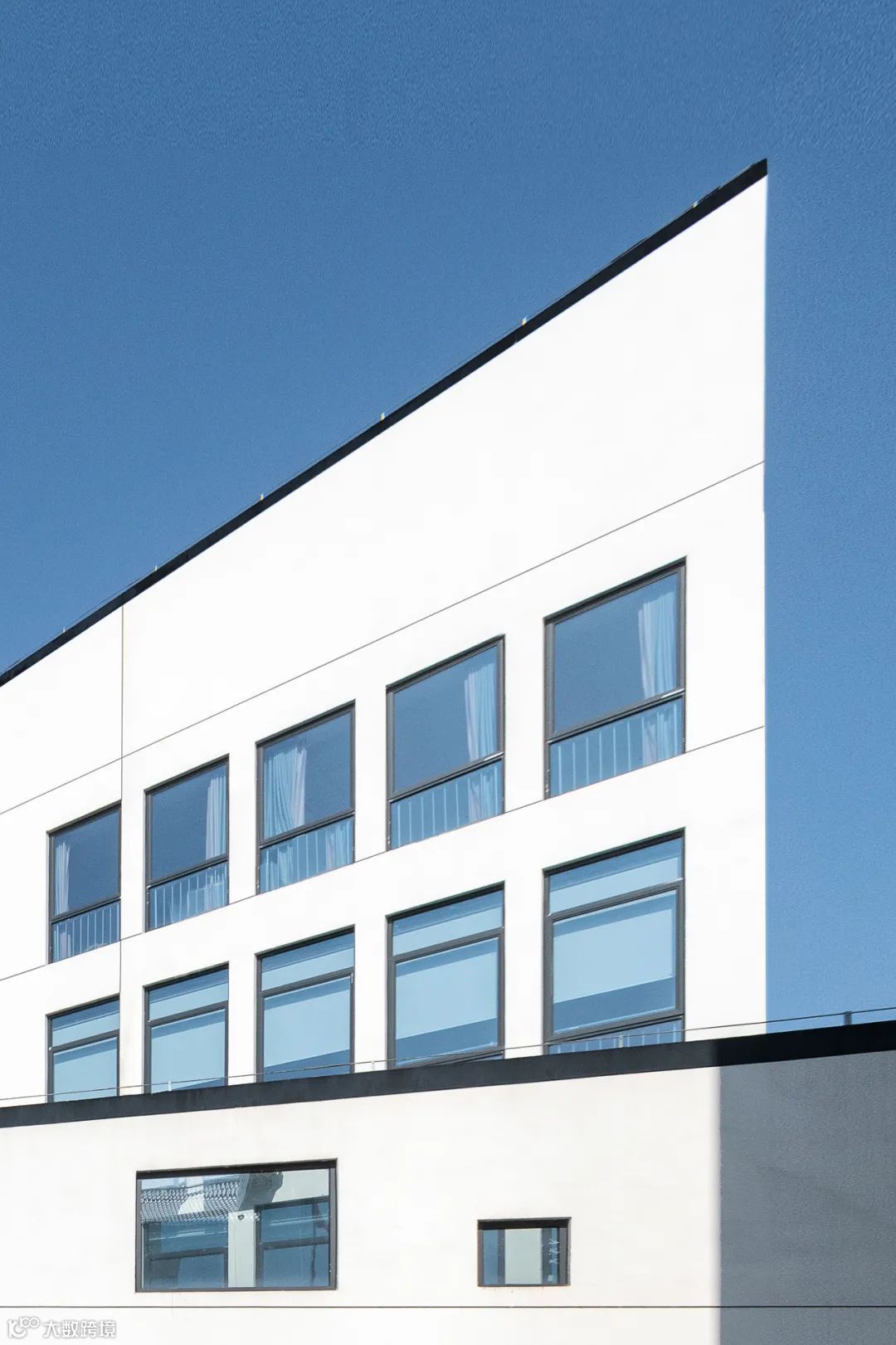 材料最终选用浅灰色岩态板,大幅轻质环保板材本身可以实现与门窗一致的模数。南向及内院界面加入了跳动的阳台,磨砂玻璃在阳光的作用下,增添朦胧的美感。更多精品关注校园建筑