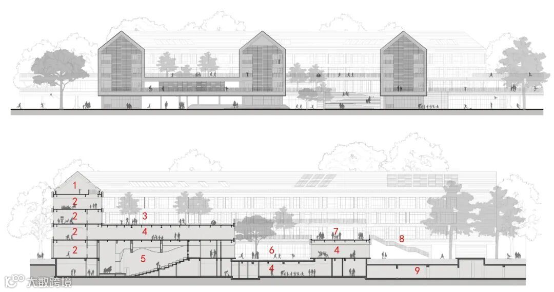 为了减少操场对教学建筑造成的干扰,在以往众多学校设计中,操场经常被放置在远离建筑的角落,但是,放眼更大的维度,对于周边高密度城市空间环境来说,学校及操场恰恰是高楼林立的城市区域中难得的一片空间洼地。