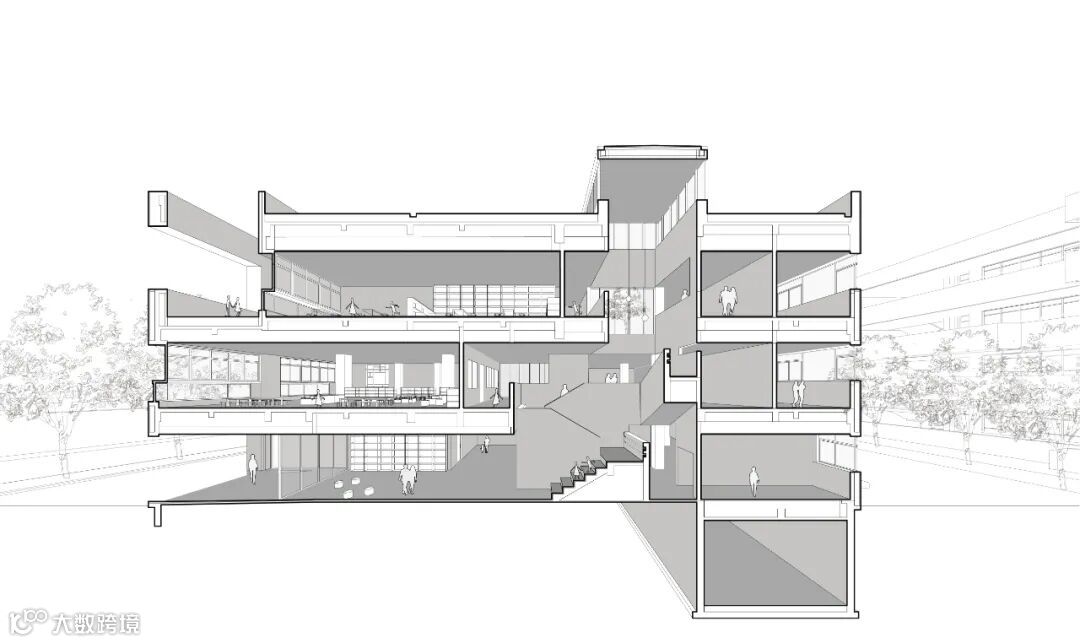 建筑在后场空间里,成为一个背景,强调实与虚的对比,透过玻璃面,视线可以到达内院的树屋,前场的廊架与广场,实现更多元的层次与空间的变化。更多精品关注校园建筑