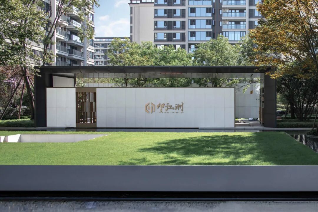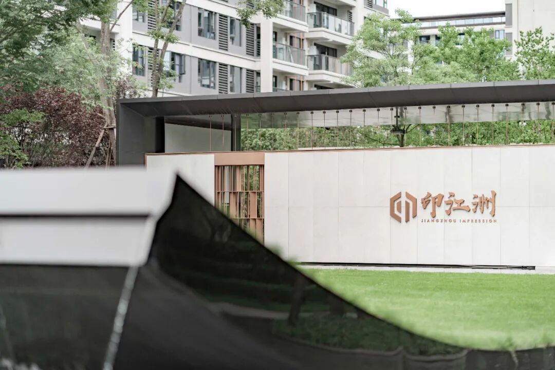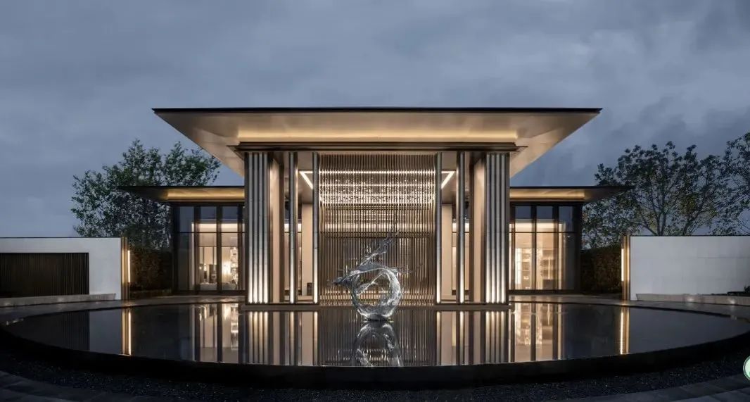 印江洲的酒店式入口将中式礼序表现得淋漓尽致。入口门头采用简约的挑檐和通透的落地玻璃,辅以简洁的香槟色铝合金格栅,凸显东方礼序韵味的同时,也彰显着现代简约的审美趣味;入口景观也以此为基调去繁就简,镜面水景倒映着精致的金属门头,镜花水月,简洁大气。