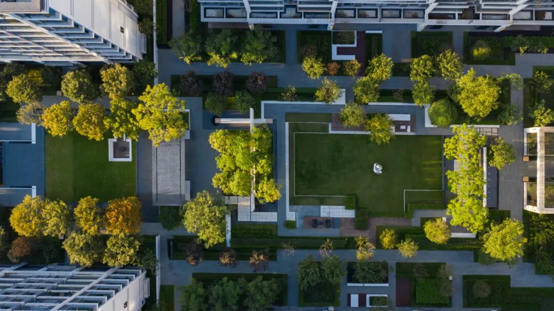 经过社区大堂后,扑面迎来的是一大片绿色。5000平方米的集中绿地、阳光中庭,全尺度无遮挡,底层架空联通四周院落。中庭景观映衬着潺潺的流水声,飞落于此的鸟儿也欢乐地鸣叫着,秋日里的红叶、黄叶、绿叶五彩斑斓,斜阳西下仿佛把人带入了山间林苑。