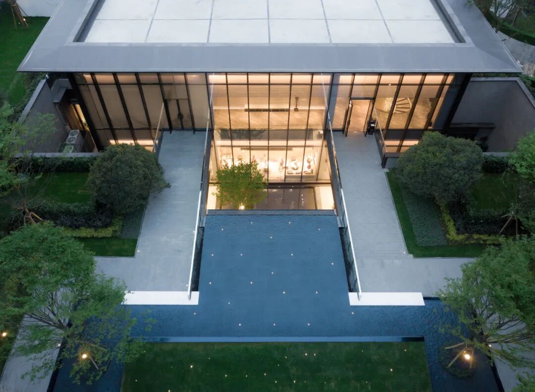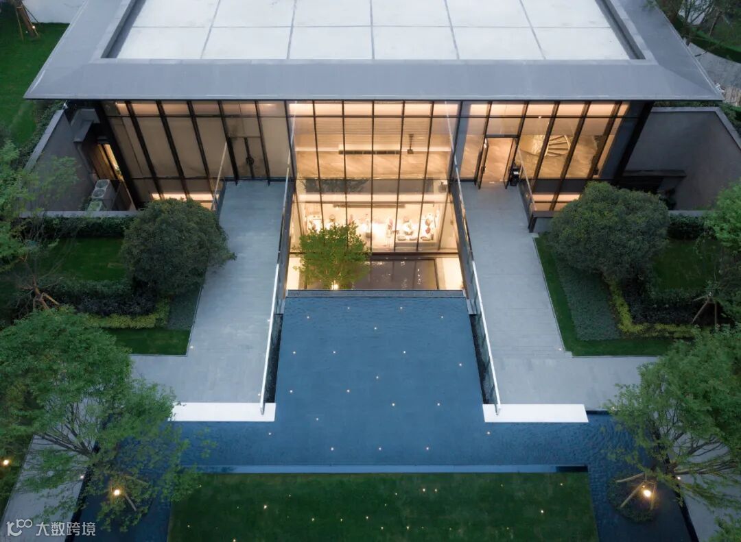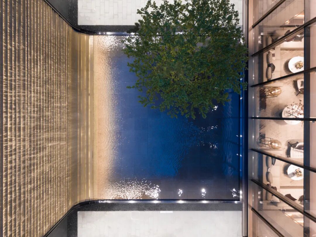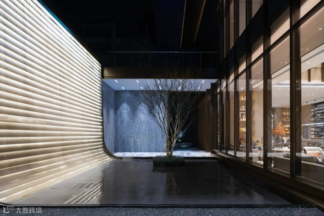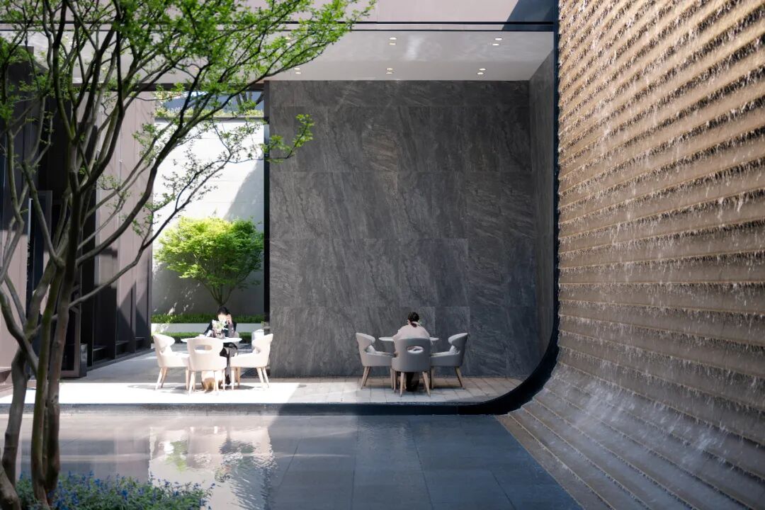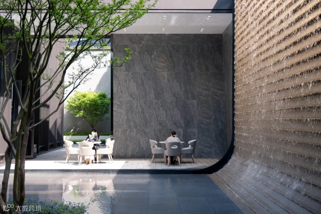 进入社区首先看到的是一个叠水的下沉庭院。庭院与地面有5米的高差,运用瀑布叠水来增加空间的灵动;瀑布前有一整面墙的夹绢玻璃,高差的叠水顺着玻璃落到底部的镜面,营造安逸闲适的庭院空间。