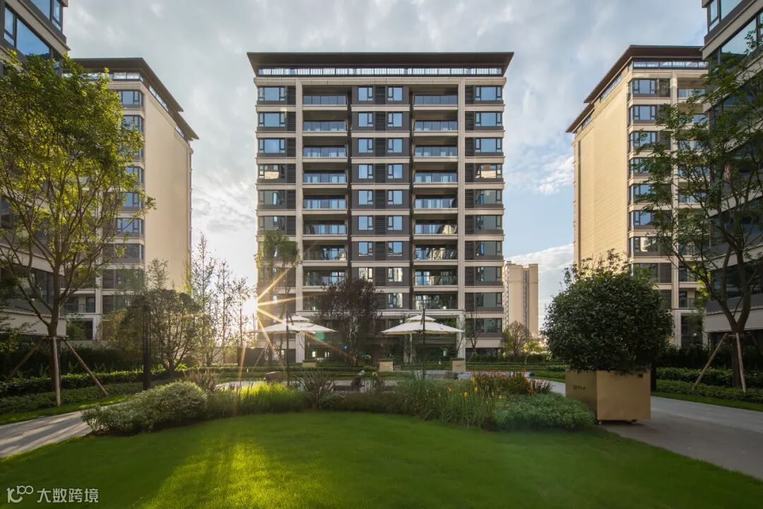 方正的建筑户型带来了外立面的平整干净。门头使用白麻材质提升入户体验,大面使用浅色真石漆,辅以局部深色质感涂料;阳台玻璃栏杆在秋日蓝天的映衬下通透舒展,立面线条中间留5公分的窄缝凹槽,凸显立面的精工品质。