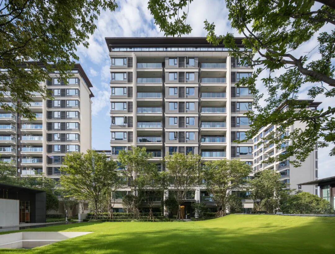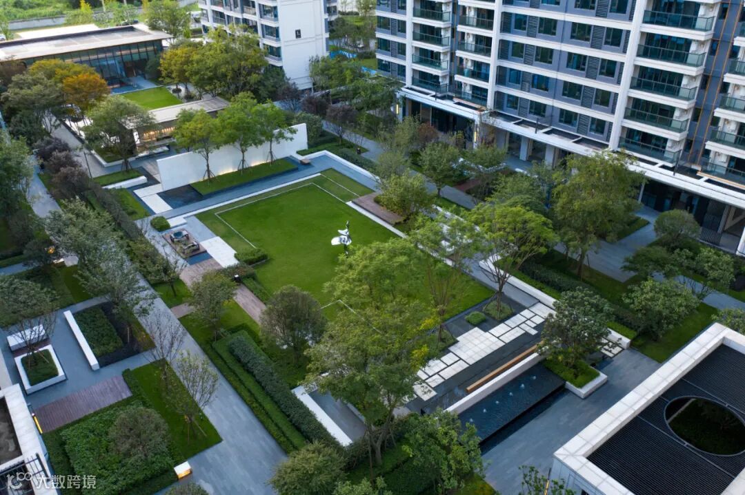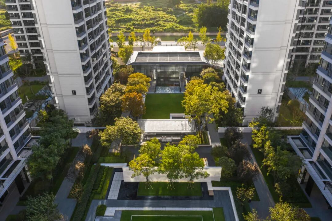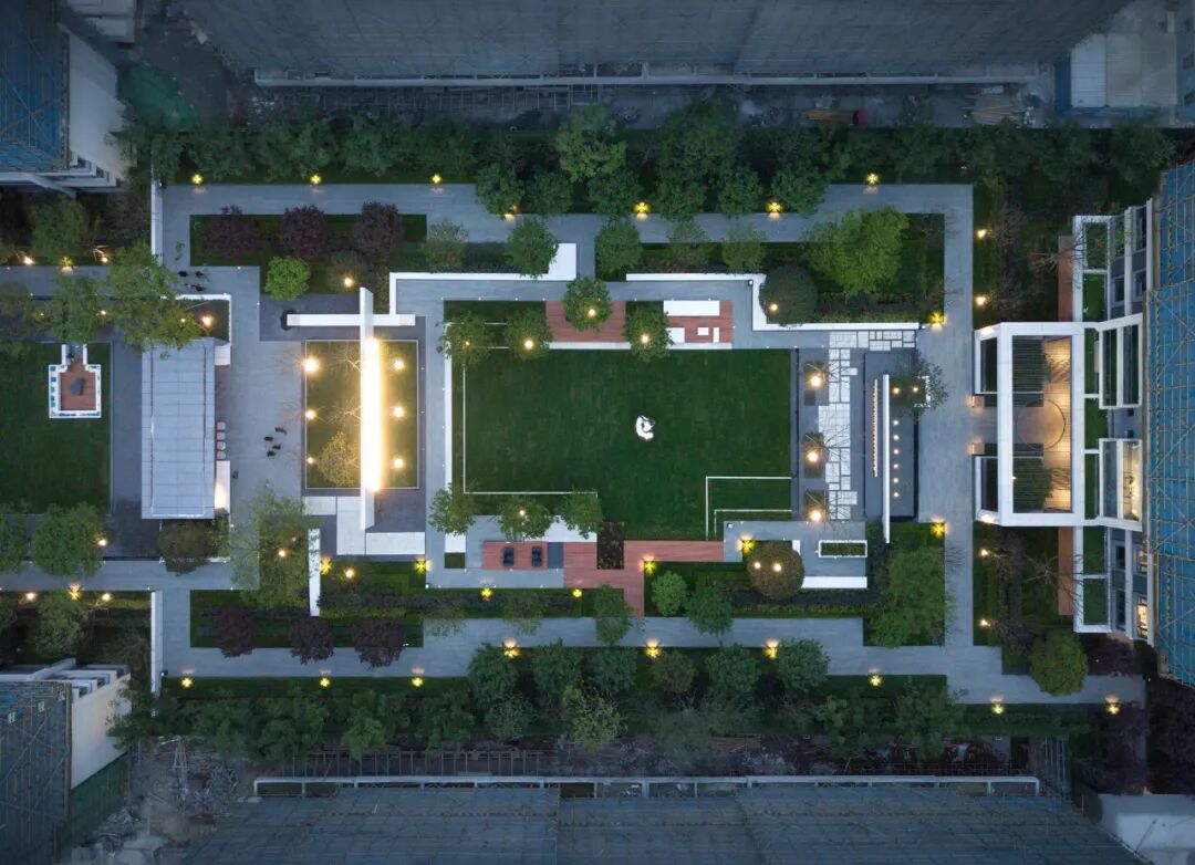 在靠近体育公园的一侧,进行了开放式设计,联通社区景观与体育公园;并通过院落围合式的整体规划布局,最大化利用边界退距,结合地形走向和外围楼栋布局形式,形成外部围合、内部安静的礼序院落空间。