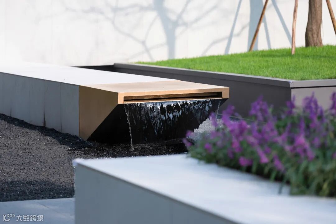 通过入口门楼,踏上景观桥便来到社区的前场水庭院。这里是入口与景观主轴的转换点,视线在这里豁然开朗。草坪与弧形不锈钢叠水相结合,叠水底部还配有星星灯的点缀;镜面水中的草坪与水景形成了几何形体的嵌套,潺潺的水从绿毯中流出,在金属材质的衬托下,景观更具有现代感。