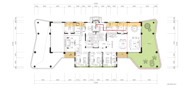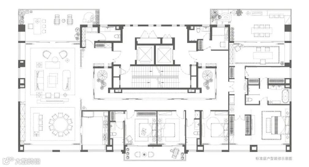 每个单元只有一户人,所以这个单元的核心筒,被包在了整个户型的最中间,这种布局方式,是大平层的较高形态,三面开的“独立核心筒”,交通动线更通透、直接、高效、私密。