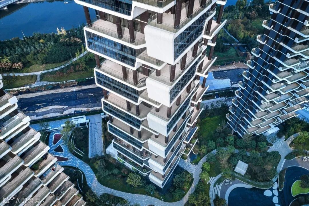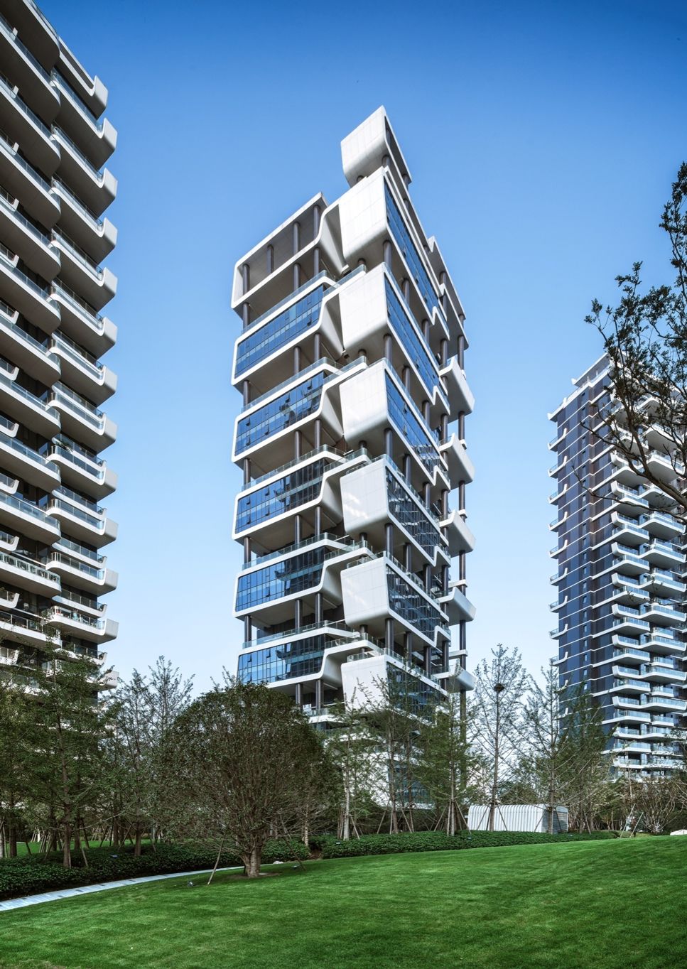 建筑立面的设计采用了深色铝板及玻璃幕墙板,使各塔楼主体与白色的流线型露台、阳台形成强烈对比,在视觉上凸显出挑部分的轻盈灵动感。