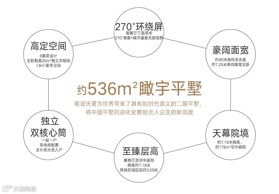 南湖天著团队研究了国内外几百家大平层,深入探索未来“生活场景的塑造”与“生活方式的打造”,引入产品领域“环绕屏”概念,设计了约251-545m²平墅产品,实现独立双核心筒,两梯一户设计;270°环幕视野俯瞰整个南湖,单户超40米面宽,客厅面宽约15米,主卧面宽约7.25米,客餐厅挑高约7.18米,最高层高约3.59米,奢侈尺度带来极高的居住舒适感,也让中国大平层的迭代上升到新阶段。