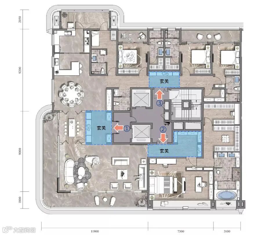 ②主卧动线:主人可直接坐电梯进入主人私人区域;