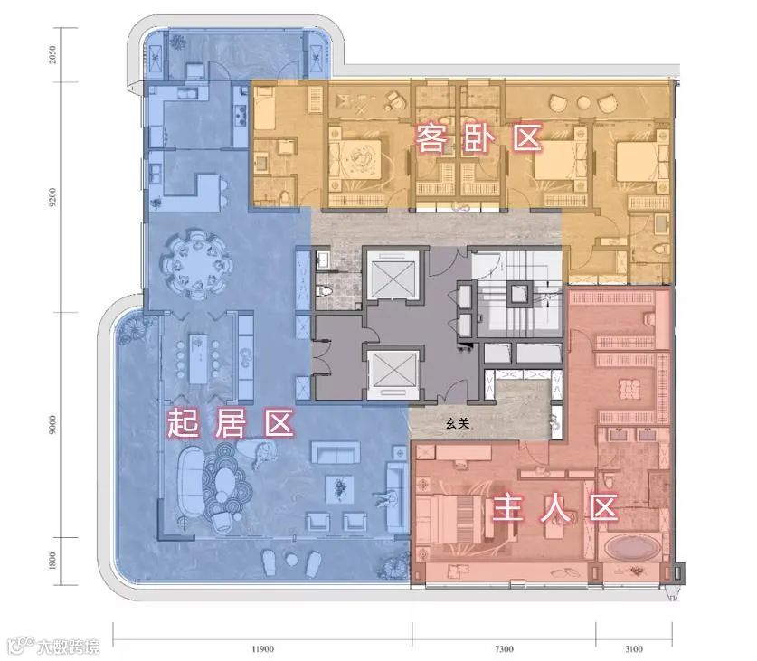 ①访客动线:从玄关直接进入客厅、餐厅、景观阳台等公共空间,路线与主人的卧室等私密区域完全不交叉;