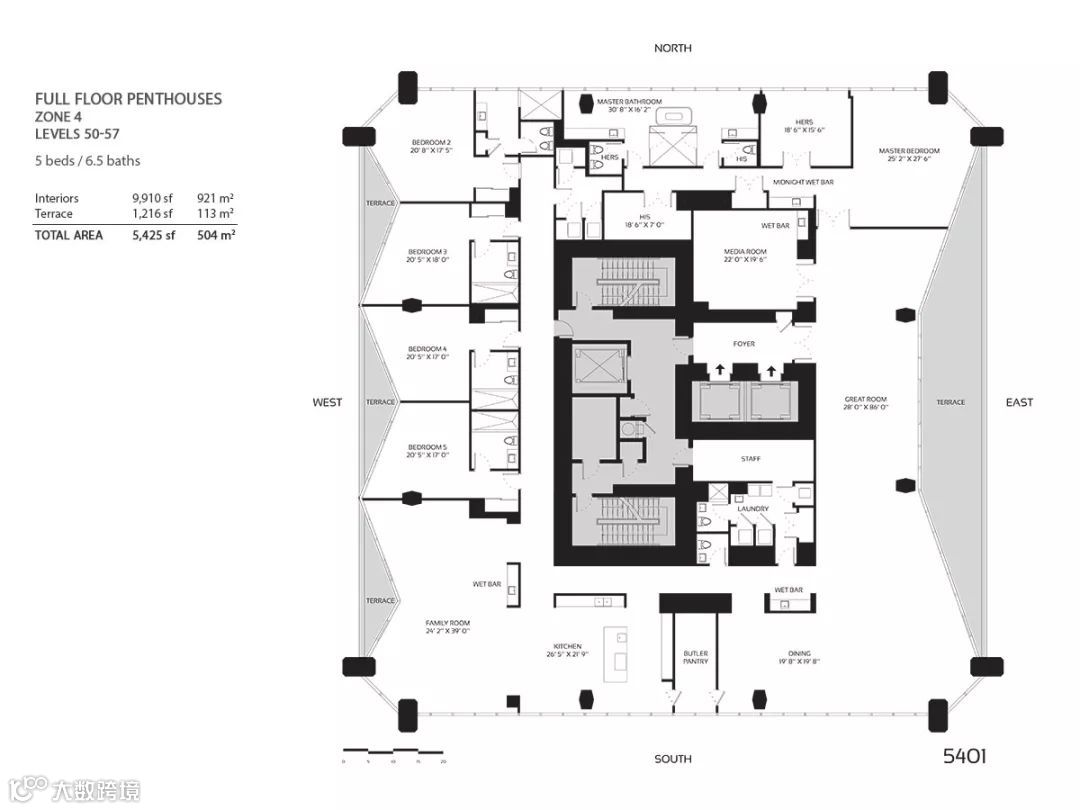 来看看全部户型里最大的为“FULL-FLOOR PENTHOUSES(全楼层仅一户) ”,主要集中在50——57楼层。