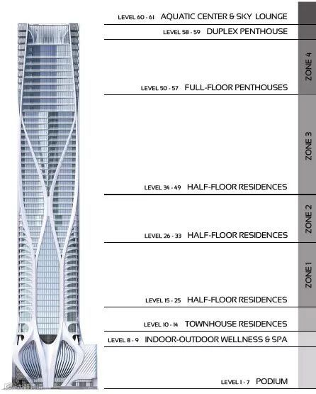 1000 Museum被称为“有史以来极复杂的摩天大楼之一”。这一幢 62 层的奢华公寓,是扎哈·哈迪德过世前,设计完成的最大的住宅设计项目。包含了 83 套住宅单元,1套两层楼的复式公寓,4套连体别墅,8套整层公寓和 70套半层住宅单元。