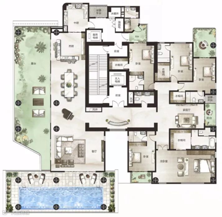 主人电梯位于平面正中,南北通透的起居空间位于入户的西边,配有中西双厨和佣人区。东面的卧室区动静分区,五个卧室均为套间,结合家庭厅的布置。