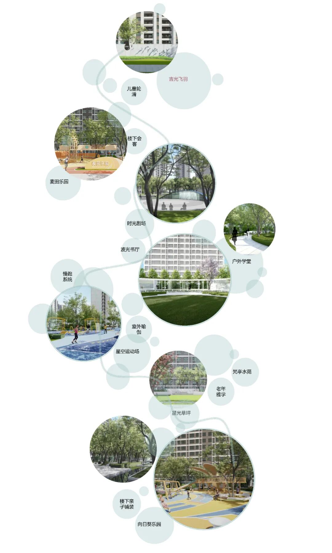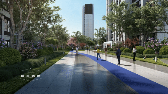 项目坐拥6.5万平的社区景观资源、3.5万平的城市公园资源以及超大楼间距的景观视野资源,其中最大楼间距可达70米。项目利用宅间绿地空间打造多个景观组团,提供多样生活场景,提升业主社区体验。