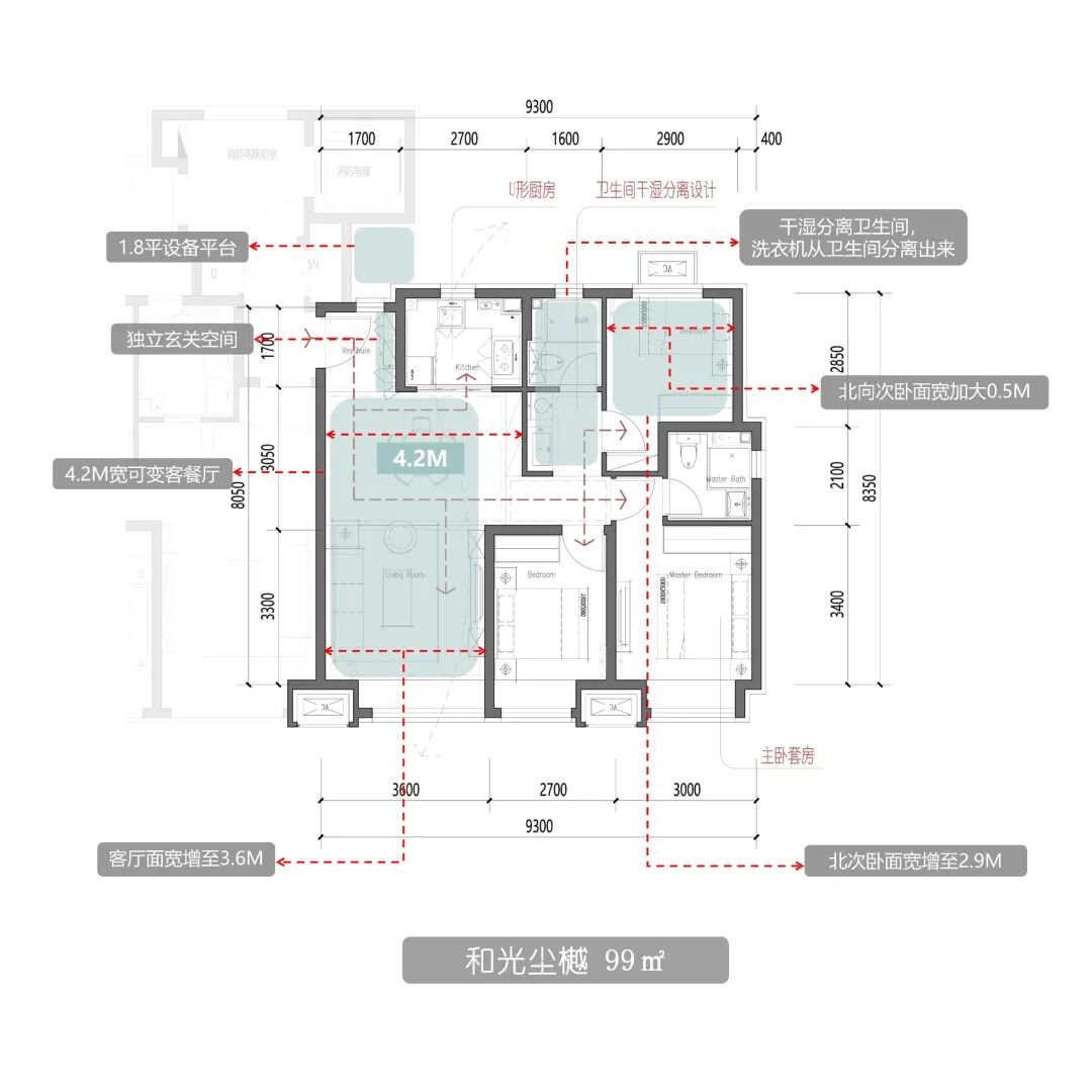 99㎡三室两卫产品,在保利·拾光年95㎡的基础上进行微创新,增加功能点,如卫生间干湿分离、独立玄关空间、3.5米客厅升级为4.2米宽厅、次卧面宽增加0.5米等,极致提高99㎡产品的性价比。