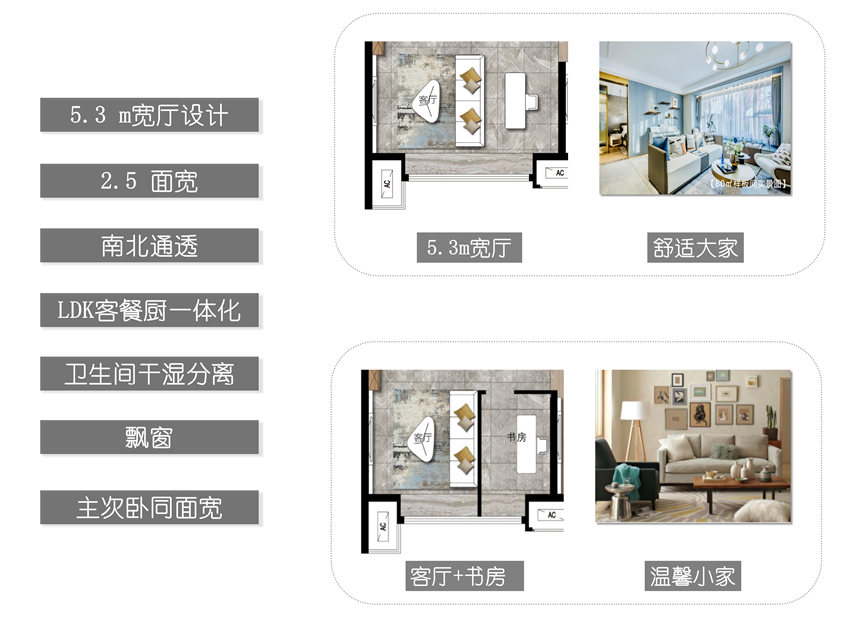 “麻雀虽小,五脏俱全”的80㎡两室一卫产品是全能空间的代表。总价低,但客厅开间5.3m,是一个多功能可变空间,保证产品基础尺度的极致功能性和舒适性,南北通透的LDK类洋房空间满足后疫情时代防疫通风需求。